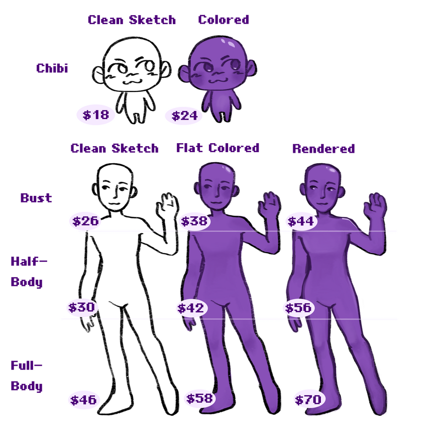 Bust = Shoulders upHalf-Body = Anything below the shoulders and above the knees upFull-Body = Anything below the knees and upPrices may fluctuate over time so make sure to double check before you place your order!Payments are made through ko-fi