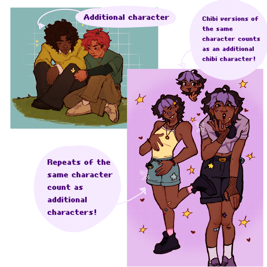 + $10 per additional chibi character+ $20 per additional non-chibi characterBASE PRICE IS BASED ON THE CHARACTER WITH THE HIGHEST PRICE